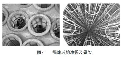 隨著袋式除塵器的普及,袋式除塵器粉塵爆炸事故也呈上升趨勢。如上海某鋼廠的干熄焦除塵系統,由于前部阻火墻制造的問題,造成火星進入除塵器內從而引起爆炸,將除塵器進口管道盲板炸出幾十米遠,除塵器箱體嚴重變形。又如沈陽某機制炭廠,由于鋸末在炭化過程中產生大量的焦油和碳氫化合物等易燃、易爆物質,而且焦油粘在濾袋上隨著時間推移越積越多,當有火星進入除塵器后就引起了除塵器爆炸。除塵器爆炸瞬間所產生的能量可使花板嚴重變形,濾袋爆裂情況見圖7。