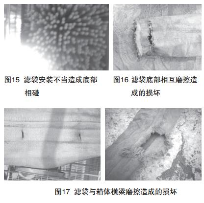 濾袋安裝不良,會由于花板、骨架等原因不與花板 相垂直(如圖15);如果過于偏斜就會造成濾袋底部相 互磨擦而損壞(如圖16);濾袋與壁板及濾袋與箱體橫 梁間也會由于磨擦而造成濾袋損壞(如圖17)。