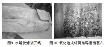 纖維氧化是纖維中分子失去(或離解)電子的過程,如PPS纖維,在高溫(150℃)條件下氧分子攻擊分 子中的“S”,并與之結合。造成PPS纖維變色、變硬、 變脆,強度降低而破損,嚴重時纖網會破碎而脫離基布 (如圖10)。氧化是濾袋損壞的又一主要因素。抗氧化 性能較差的濾料主要有:聚丙烯、聚苯硫醚(PPS)等。
