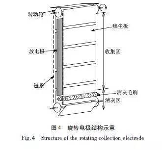 旋轉(zhuǎn)電極式電除塵器與常規(guī)電除塵器的除塵原理完全相同,在清灰方式上有很大改變。旋轉(zhuǎn)電極是由若干個小塊極板固定在板鏈上低速旋轉(zhuǎn),極板由原來的整體壓型板改為小塊極板,通過板鏈帶動旋轉(zhuǎn)。其清灰方式采用旋轉(zhuǎn)鋼刷清灰,從根本上改變了常規(guī)電除塵器的振打裝置清灰,徹底避免了振打清灰造成的二次揚(yáng)塵,同時也解決了高比電阻粉塵的“反電暈”問題]。