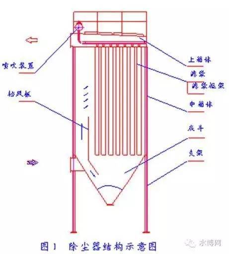 含塵氣體由灰斗上部進風(fēng)口進入后,在擋風(fēng)板的作用下,氣流向上流動,流速降低,部分大顆粒粉塵由于慣性力的作用被分離出來落入灰斗。含塵氣體進入中箱體經(jīng)濾袋的過濾凈化,粉塵被阻留在濾袋的外表面,凈化后的氣體經(jīng)濾袋口進入上箱體,由出風(fēng)口排出。