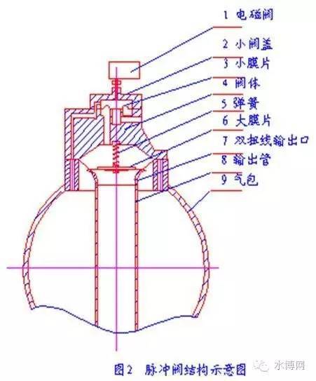 隨著濾袋表面粉塵不斷增加,除塵器進出口壓差也隨之上升。當(dāng)除塵器阻力達(dá)到設(shè)定值時,控制系統(tǒng)發(fā)出清灰指令,清灰系統(tǒng)開始工作。首先電磁閥接到信號后立即開啟,使小膜片上部氣室的壓縮空氣被排放,由于小膜片兩端受力的改變,使被小膜片關(guān)閉的排氣通道開啟,大膜片上部氣室的壓縮空氣由此通道排出,大膜片兩端受力改變,使大膜片動作,將關(guān)閉的輸出口打開,氣包內(nèi)的壓縮空氣經(jīng)由輸出管和噴吹管噴入袋內(nèi),實現(xiàn)清灰。當(dāng)控制信號停止后,電磁閥關(guān)閉,小膜片、大膜片相繼復(fù)位,噴吹停止。